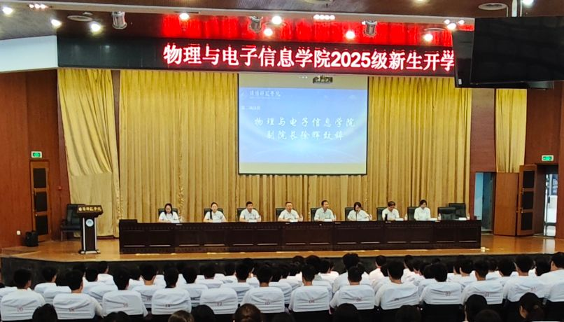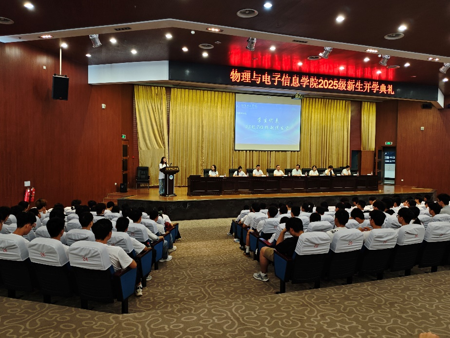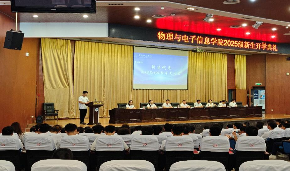 9月19日上午9时,物理与电子信息学院2025级新生开学典礼于图书馆一楼报告厅顺利举行。物理与电子信息学院党委书记陈擘威,副院长徐辉、武文斌,各专业负责人,新生辅导员及全体25级新生参会。