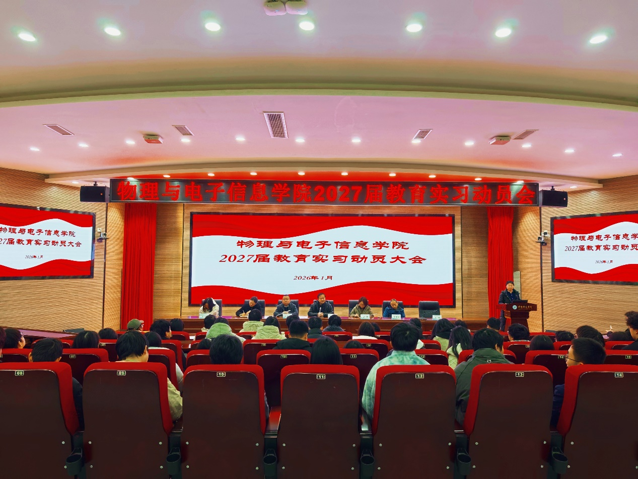 2026年1月15上午10点,物理与电子信息学院 2027 届教育实习动员会在厚德楼 247 教室隆重召开。学院实习工作领导小组成员、带队教师以及2027 届物理学专业全体学生齐聚一堂,以“夯实实践能力、锤炼师者素养”为核心,明确实习要求、凝聚奋进共识,为即将启程的教育实习之旅吹响集结号。