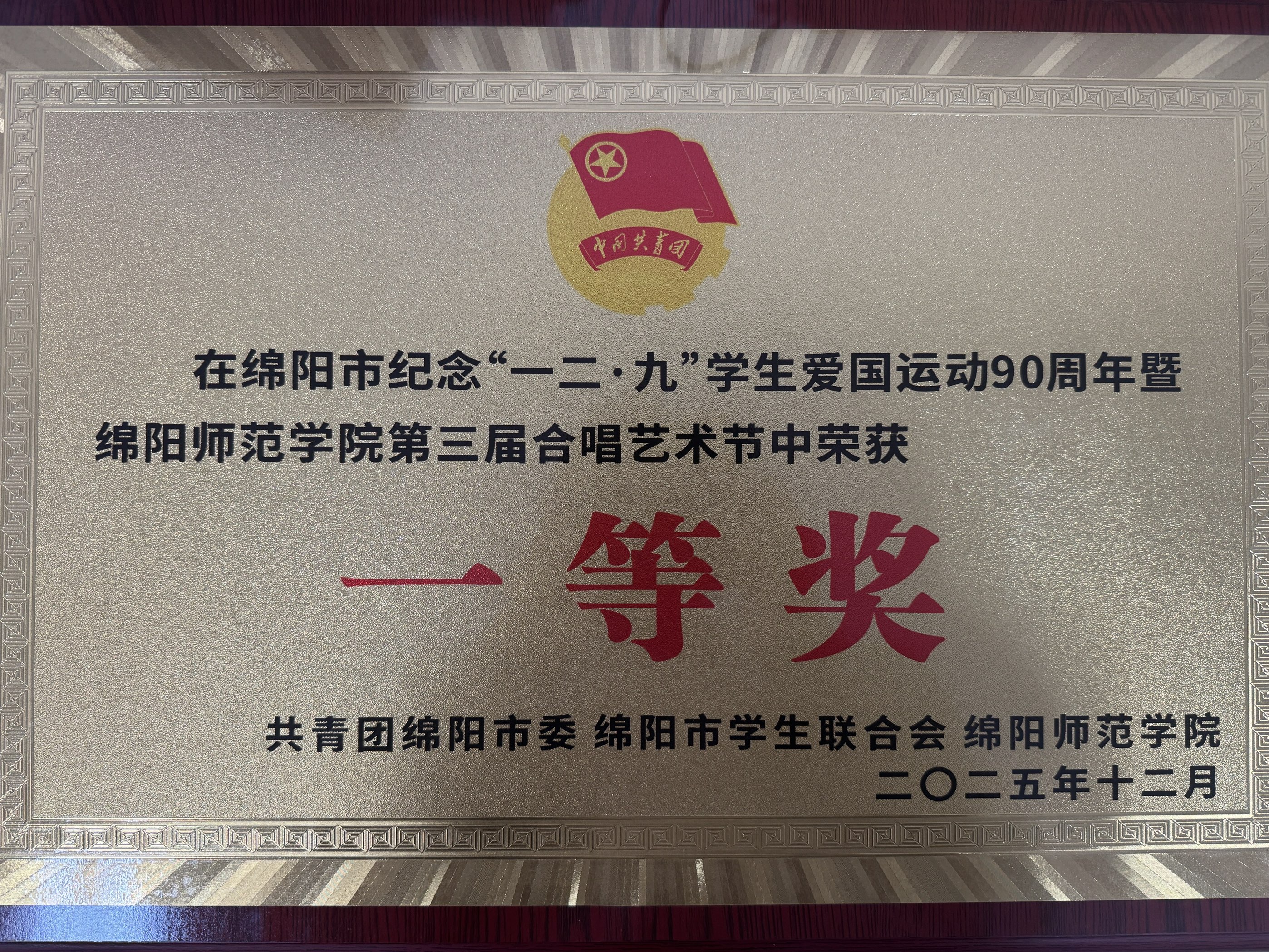为深入学习贯彻党的二十大、二十届三中、四中全会精神和全国教育大会精神,持续深化美育教育,近日2025级2班代表学院在学校举办的绵阳市纪念“一二·九”学生爱国运动90周年暨绵阳师范学院第三届合唱艺术节中,凭借一曲《追寻》,以89.7分的成绩在全校19支参赛队伍中脱颖而出,获得一等奖。